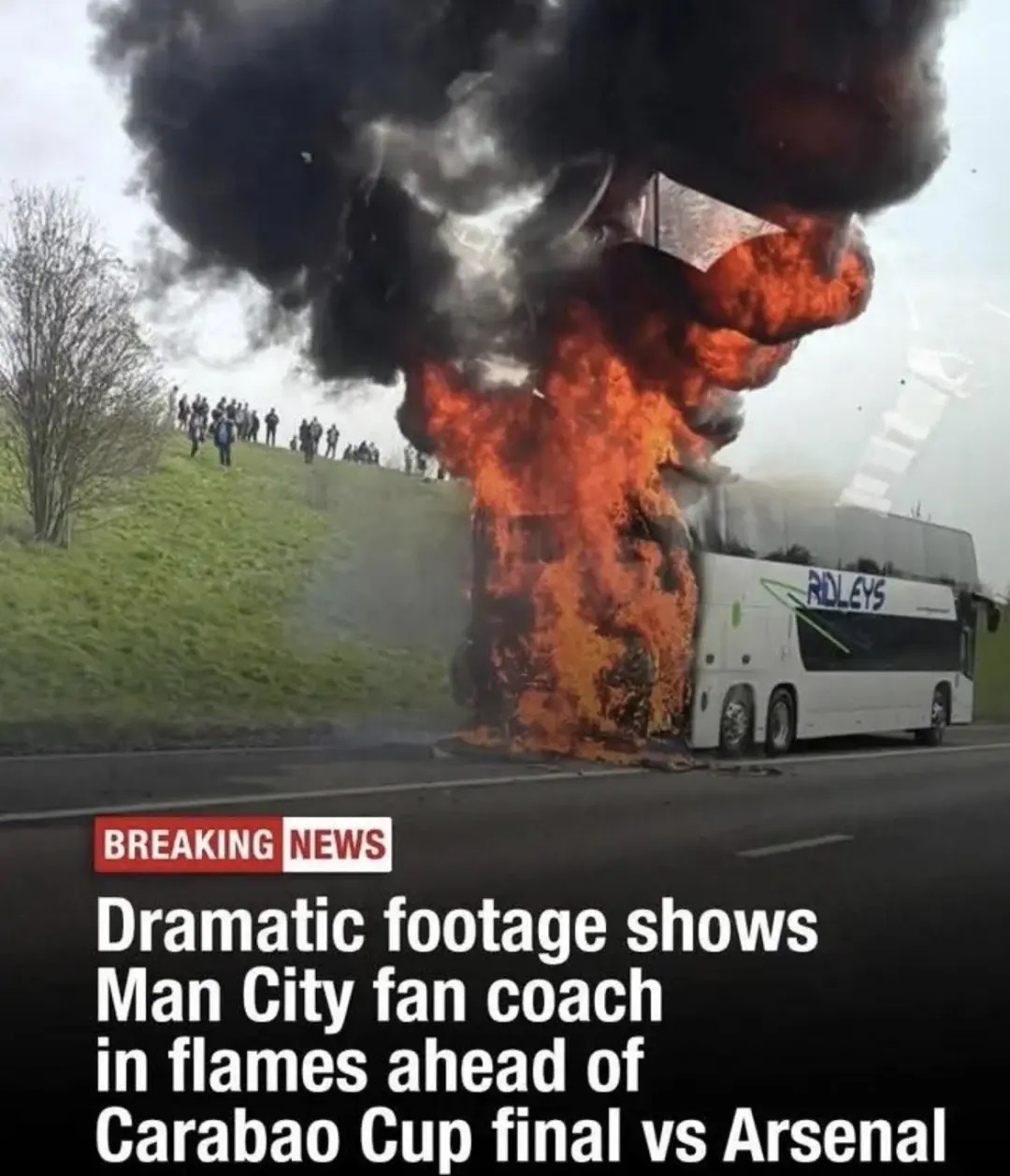 载曼城球迷大巴在高速起火,温布利决赛前交通一度瘫痪