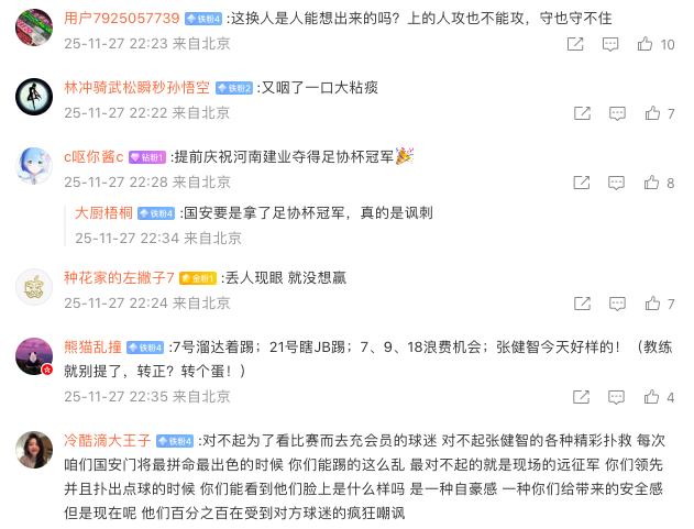 而国安球迷完全不接受愤怒写道:“丢人现眼!”;“:不算特殊时期的话,5年了才有机会踢洲际比赛。这就是你们的态度?这不是技战术的问题,这是态度的缺失和管理的失职!”:“不想踢就弃权完事儿,别把球迷当傻子!”“除了张健智外,其他人但凡有点羞耻心也不会这么踢了,一群没有荣誉感的混子!”